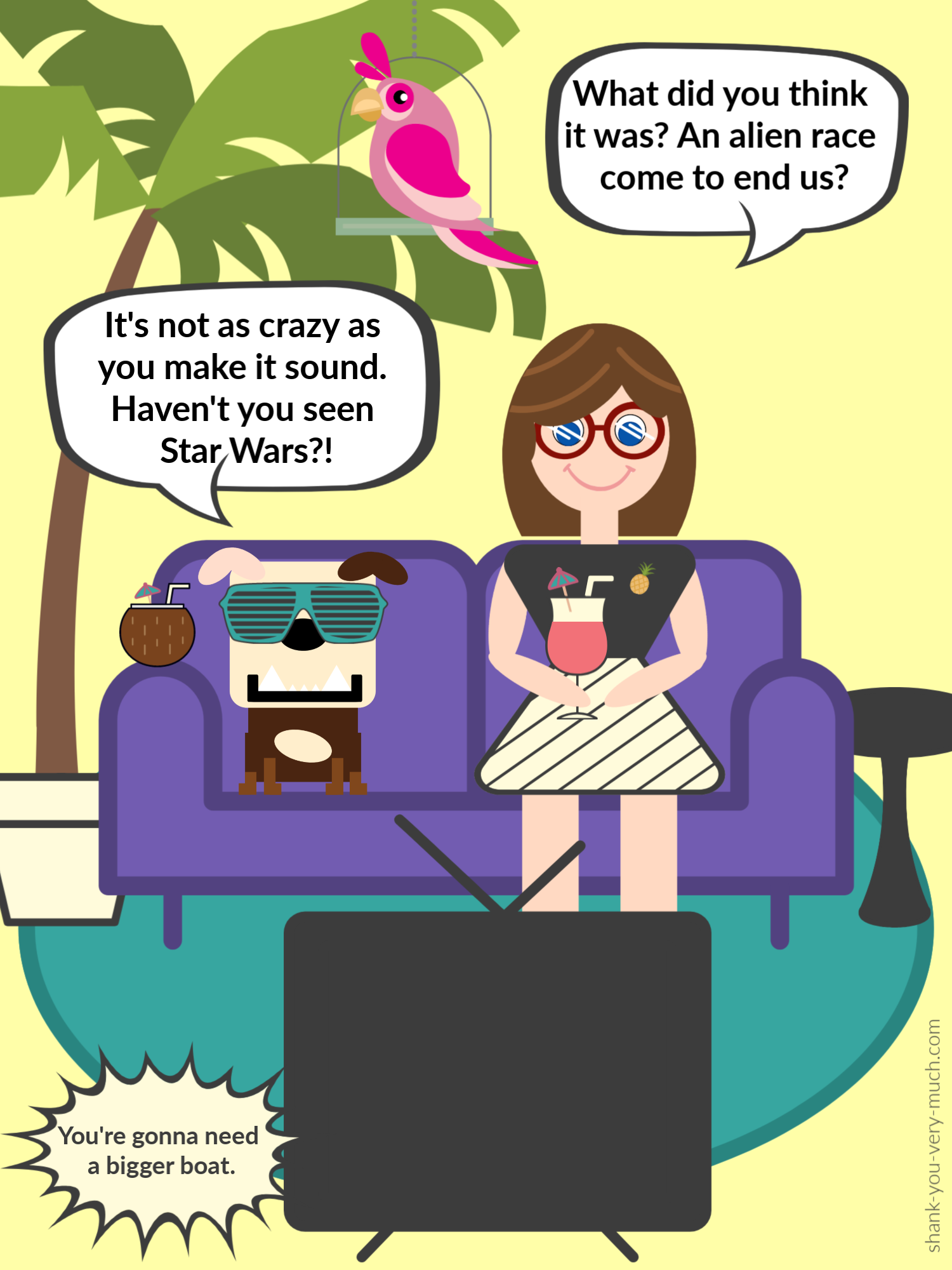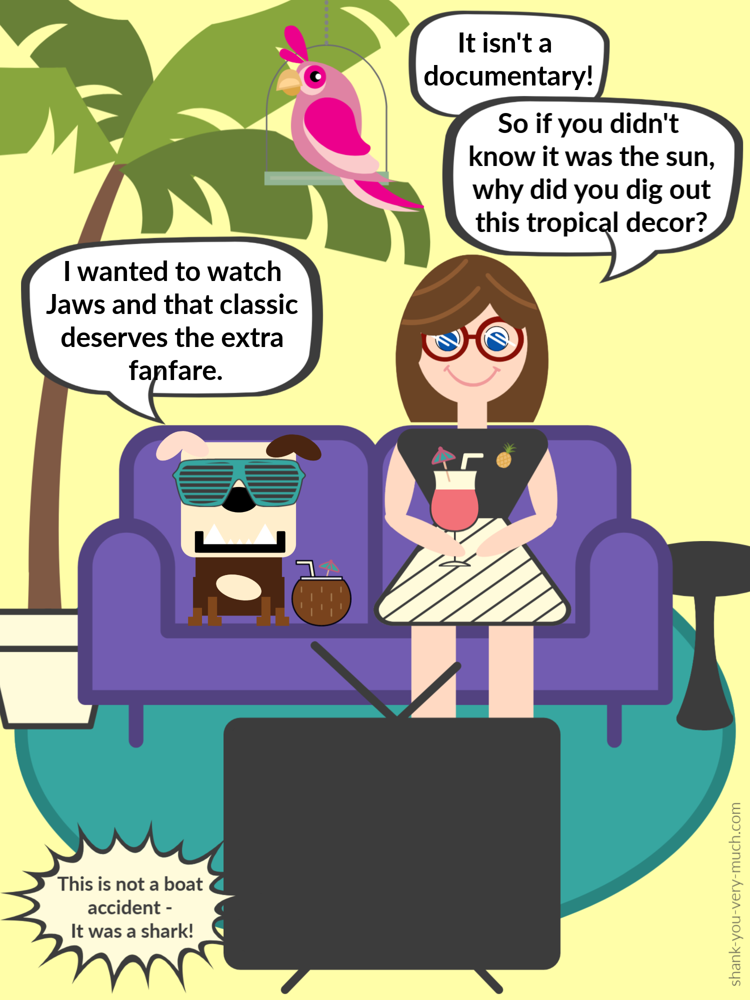Jaws…just a big old fish. Maybe sharks are really dinosaurs and Jaws is waiting to extract revenge for man’s global cooling that wiped out his land based cousins.