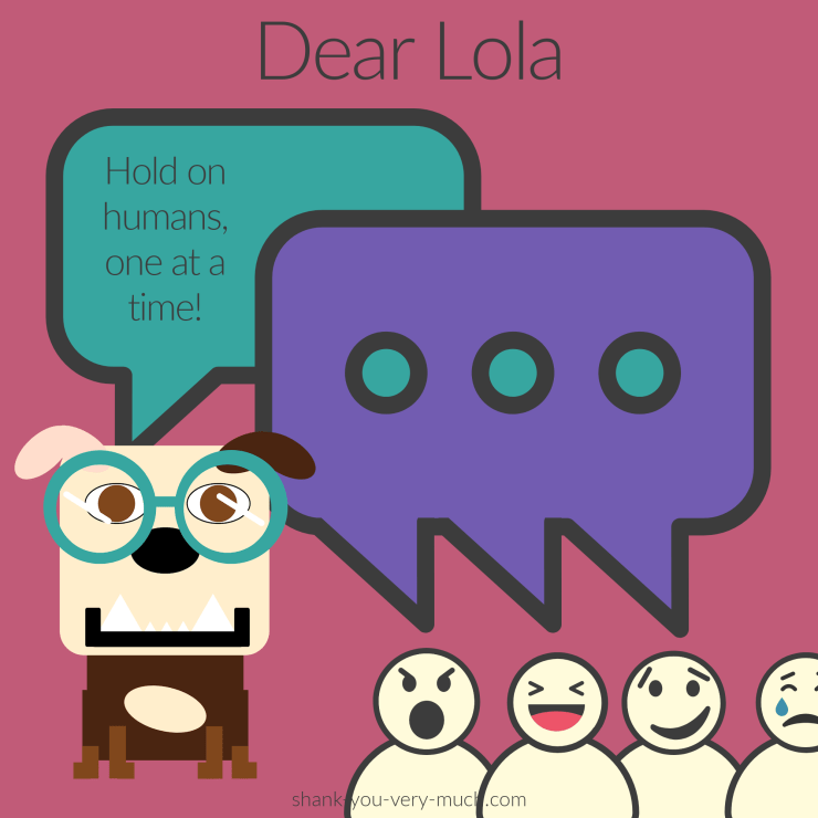 Lola wants to hear from you. Send in your questions today by clicking the link in the menu at the top of the page. You can also reach Lola at any of my social media channels.